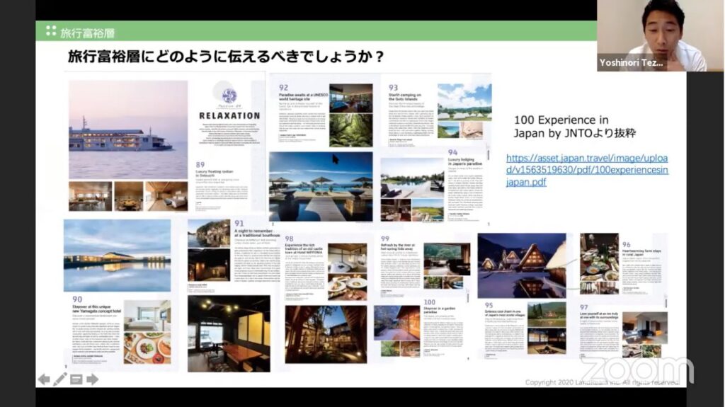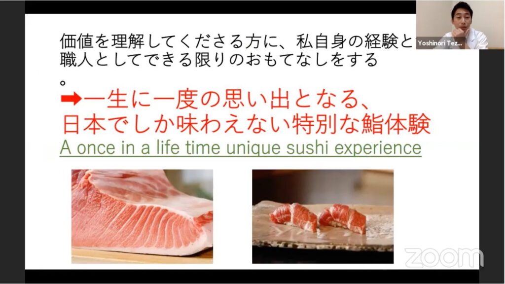 富裕層インバウンド WEB 講演 登壇(株式会社MATCHA プロデユース) 2020.06.24 | メディア掲載 2020年6月24日 コロナ渦の中、オンラインによるセミナー、講演が開催されており、今回、インバウンドメディアで最大手の一つ、株式会社MATCHAさんからの依頼でラグジュアリーインバウンドのオンラインセミナーをやらせていただきました。 日本のまだ知られていない魅力を海外の方々につたえようと考えている株式会社MATCHA様が開催した今回のオンラインセミナー。「富裕層に向けて日本の文化をどう届けるか」ということをテーマに元トリップアドバイザー社長、株式会社ランドリーム代表取締役:原田静織様。MATCHA代表取締役:青木優様、と共に海外富裕層にどの様にアプローチ、ご紹介するかをお話しさせていただきました。 訪日旅行者数を追うスタイルから、少なくても経済効果の高い富裕層にフォーカスすることで、インバウンド業界はさらに発展を遂げる可能性があります。 特にアフターコロナにおいては富裕層インバウンドは早期に戻る可能性があり、どの様なアプローチ、対策が有効かということを日頃私が行っている『お寿司の本格体験握り』『訪日外国人お寿司パーティー』などのインバウンド事業の例、2019年に行ったG20大阪サミット配偶者プログラムなどの経験からお話しさせていただきました。 外国人富裕層に向けてアプローチに関しても、具体例を紹介し、またどのようなおもてなしがラグジュアリー訪日外国人(個人・法人含む)に響くのか!ということもお話しさせていただきました。 日本の地方には、世界の富裕層を魅了するコンテンツがたくさん眠っていると考えており、その価値を正しく伝え、海外の富裕層を誘致することが今後のインバウンドには欠かせません。 元旅行会社勤務、現在鮨職人として、第一線で訪日外国人観光客に接し、20年近くの経験があるヨーロッパをはじめ世界の富裕層に触れていた経験を活かしつつ、 『ラグジュアリーインバウンドに特化』し、食のみでなく、クライアントの強みをどのように海外富裕層に届けるかをお伝えするコンサルティング業務を、他企業、自治体等に積極的に行っていき、日本の素晴らしさを世界の富裕層に伝えていきたいと考えております。 *株式会社MATCHA MATCHAは、世界240以上の国・地域から月間340万人以上が訪れる、日本最大の訪日観光メディアです。観光、グルメ、文化、便利情報など、日本に関する魅力的な記事を10言語で発信。多国籍の編集者がプロの目線で編集し、熱量を持った記事をお届けします。 記事だけでなく、旅マエに嬉しい宿泊、ツアー、Wi-Fiなどの予約から、旅ナカで使えるクーポン券まで完備。訪日観光プラットフォームとして、日本旅行を総合的にサポートします。 https://company.matcha-jp.com/ このページをシェア 関連記事 2020年6月1日 学研『よいこの学習』2020年6月号に掲載 2020年2月8日 慶應義塾湘南藤沢中等部にて講演 2020年2月3日 東京クラブ「総合芸術としての日本の『鮨』を通じて日本を紹介する。」講演 2019年12月11日 田園調布学園にて『鮨を通じて、日本文化を伝える』講演 2019年9月24日 ニューヨーク国連総会関連企画「High Level Conversation with First Ladies and World Leaders on Ocean Conversation」にて鮨ケータリングをご提供